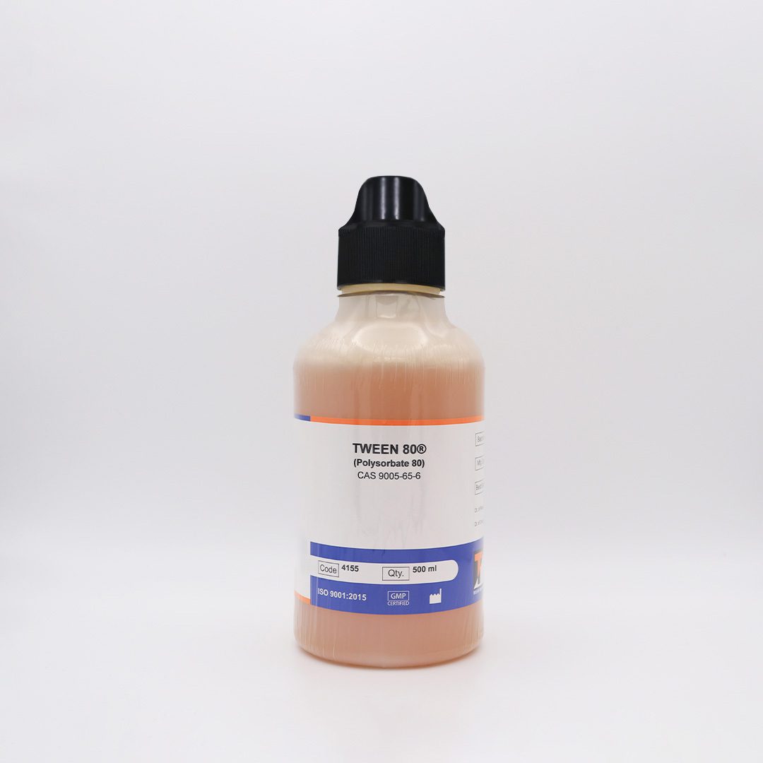 Tween 80 is a viscous, water-soluble, non-ionic emulsifier derived from polyoxyethylene sorbitan monooleate. Slightly more hydrophobic than Tween-20, it allows for broader use in certain biochemical applications. It is pale yellow and widely used as an emulsifier and stabilizer.
